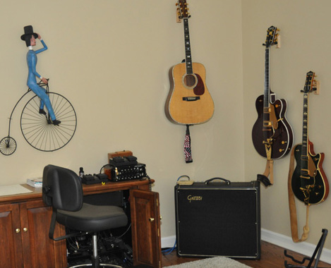 Enter Suzy Q – she lives with a dog so she is more aggressive. She is also a little hyperactive and she bores easily. On her last stay here, she was making my cats nuts. They are a little older than she is and she insisted on the prime real estate in the house.  That always belongs to the resident alpha cat unless she allows another cat to sleep there. The topper came when she eyed the guitars that hang on the wall in the music room – the Martin and two Gretsch guitars that are the love of my beloved husband. Suzy climbed up on the amplifier and proceeded to start banging the guitars into the wall. It amused her. It did not amuse beloved husband.