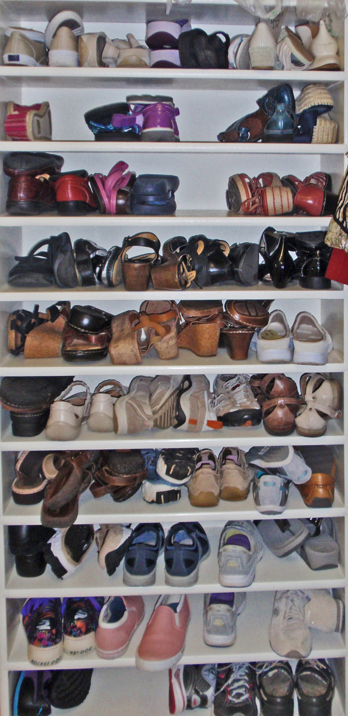 They make the best styles for women who can wear really high heels. Today, I see actresses wear “stilettos.” Descriptions have them at 5 inches or higher. How can anyone walk on those? My feet just aren’t long enough! I have enough trouble with a 2 inch heel which is the absolute highest I can go. Somehow they always have an orthopedic look to them — something my mother would wear. That doesn’t stop me from buying lots of them! Last year the beloved husband made a 6 foot high cabinet to house my fabulous collection (of mostly orthopedic looking footwear). To be sure the cabinet was the correct size, I inventoried my “collection,” measured and sketched out what the cabinet dimensions would need to be. Oops! Too big for my enormous walk-in closet! We could buy another house or…….