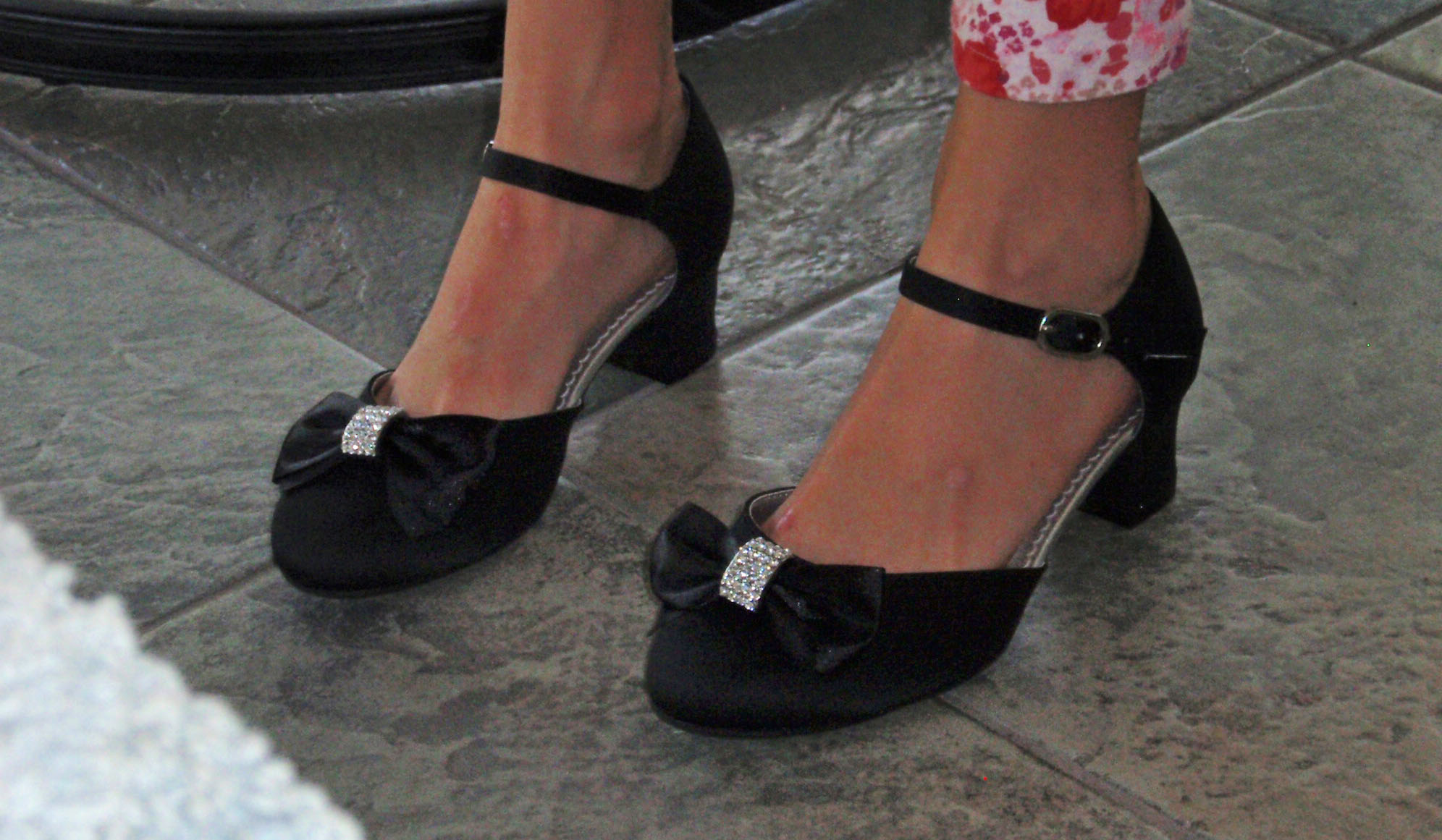 After recovering from this shock, the other granddaughter asked if she could get new shoes instead of an outfit. Sure! Whatever she needs. We went to another store where she picked out…wait for it…prom shoes. They have a small chunky heel and are made of fabric with a satin bow and rhinestones. They are for school.