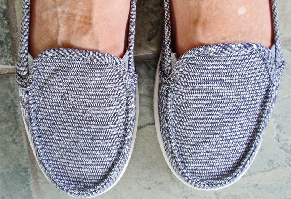 Usually I find something that’s somewhat trendy with support and cushioning. Today’s purchase looks like dock shoes but are much more comfortable. (I can’t wear real dock shoes, they are too wide.) They are a charcoal and white stripe and will look great with…..exercise clothes.