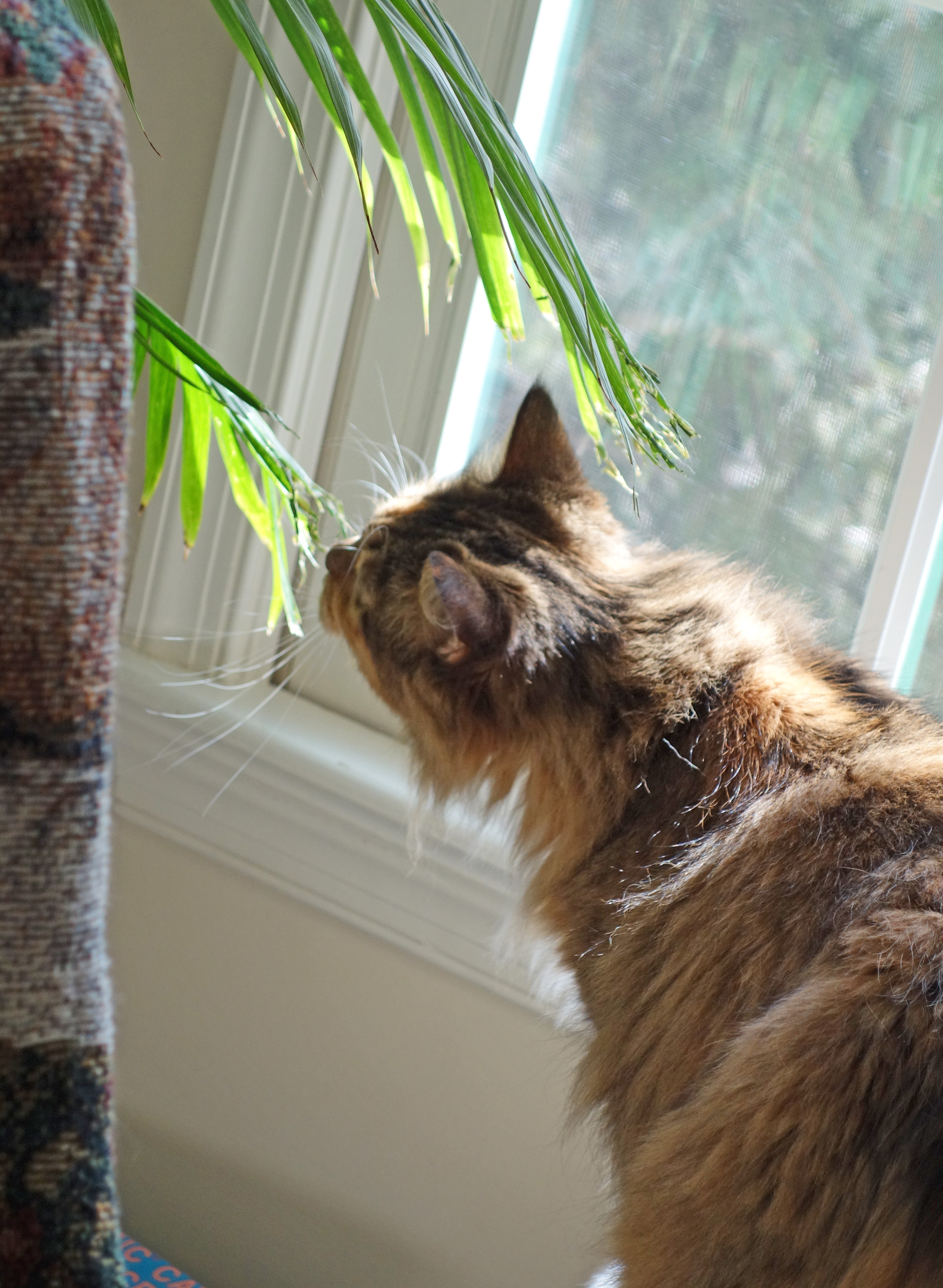 My cats don’t eat plants except for cat grass or so I thought. Last week I noticed that the palm tree I am wintering over has some chewed fronds. It’s right in back of the chair that Morgan sleeps on. It doesn’t take a detective to figure this out…or does it.