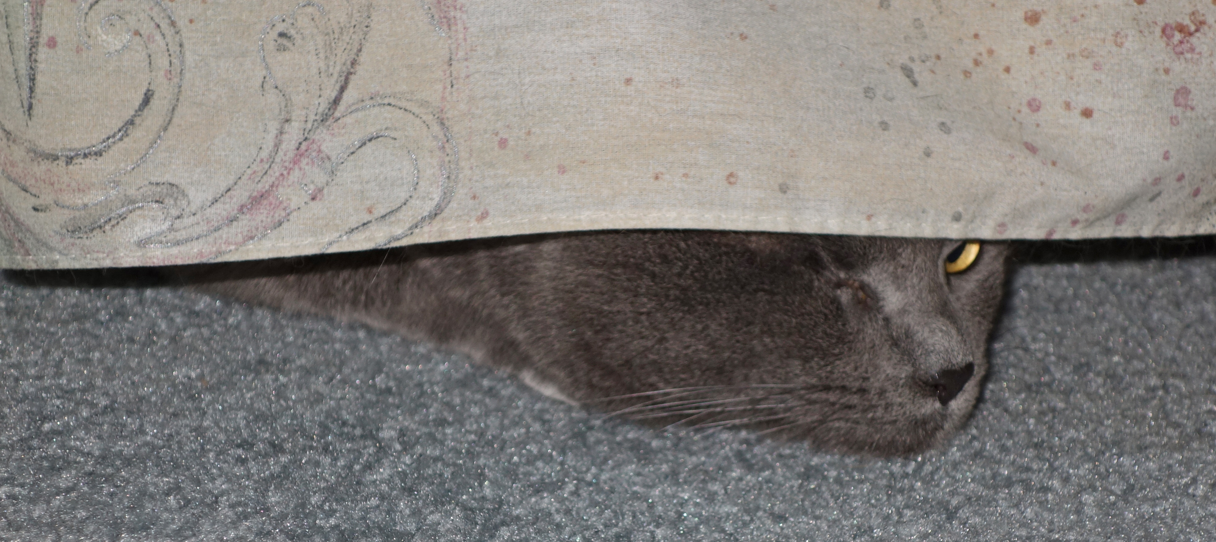 Although she is 4, Morgan can be as pesky as a young kitten. She does know when to run and hide (usually after she has pestered another cat to the point of a slap down). This is what I saw.