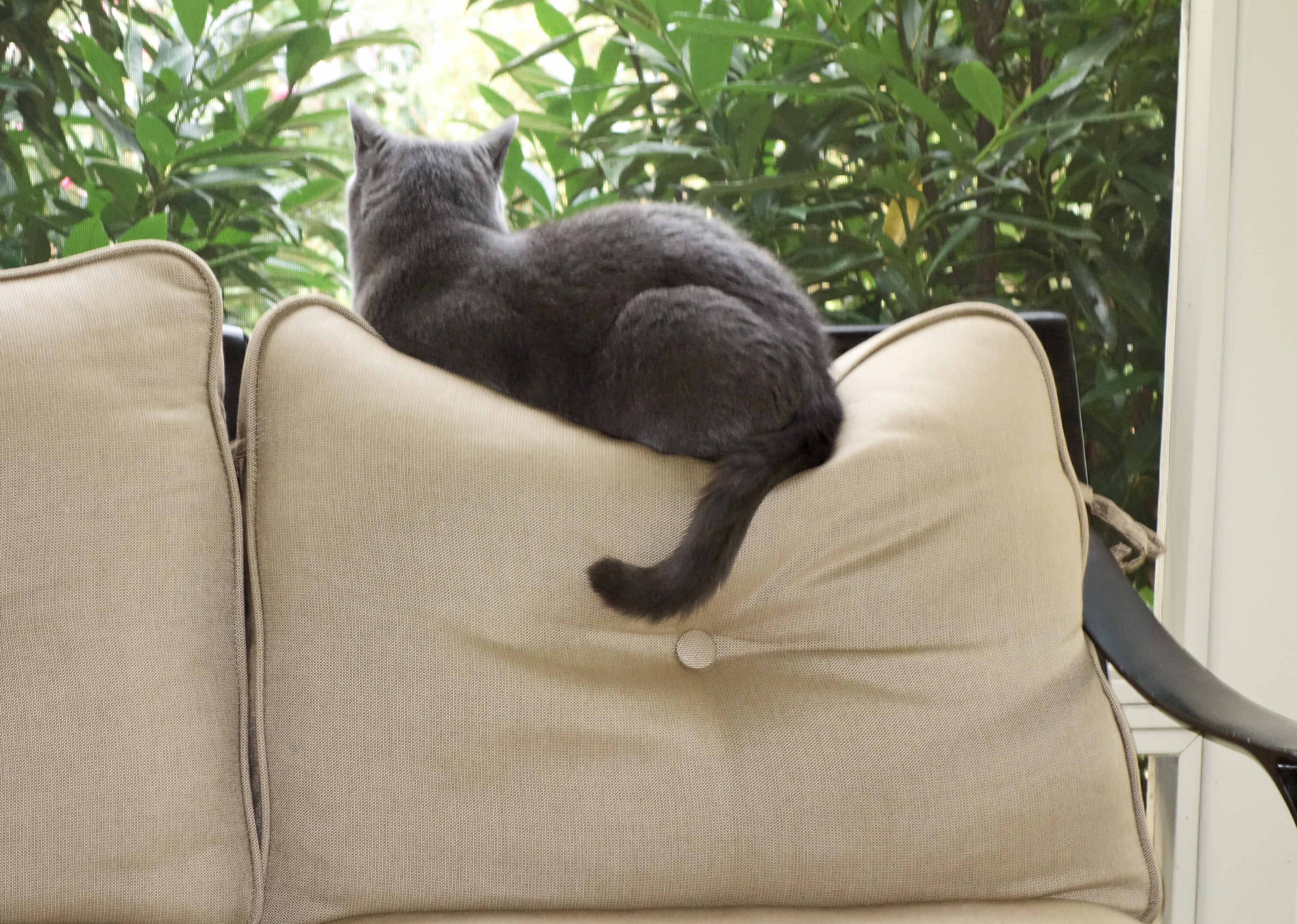 Sometimes I wonder why my furniture cushions look wonky. Perhaps this is why.Morgan: What? I’m supposed to sit on the seat cushion? I can’t see out then! Who will monitor the chipmunks?