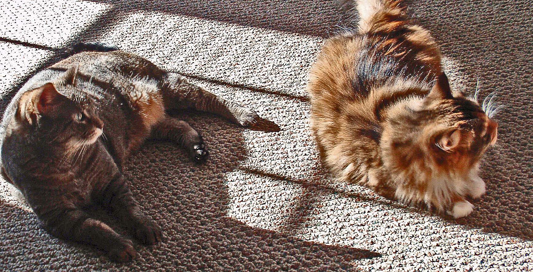 My two tolerate each other. They are not siblings. Norie, the black cat, loves to sneak up behind Sister and touch her nose to Sister’s tail, just enough to startle her. Siblings from what I hear are the ones who snuggle etc.Have you found that to be true?