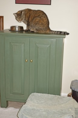 She has also learned to jump onto the dresser that contains the forbidden (to her) dry kibble. There is good news in that message as prior to her last weight loss she wasn’t able to jump that high.