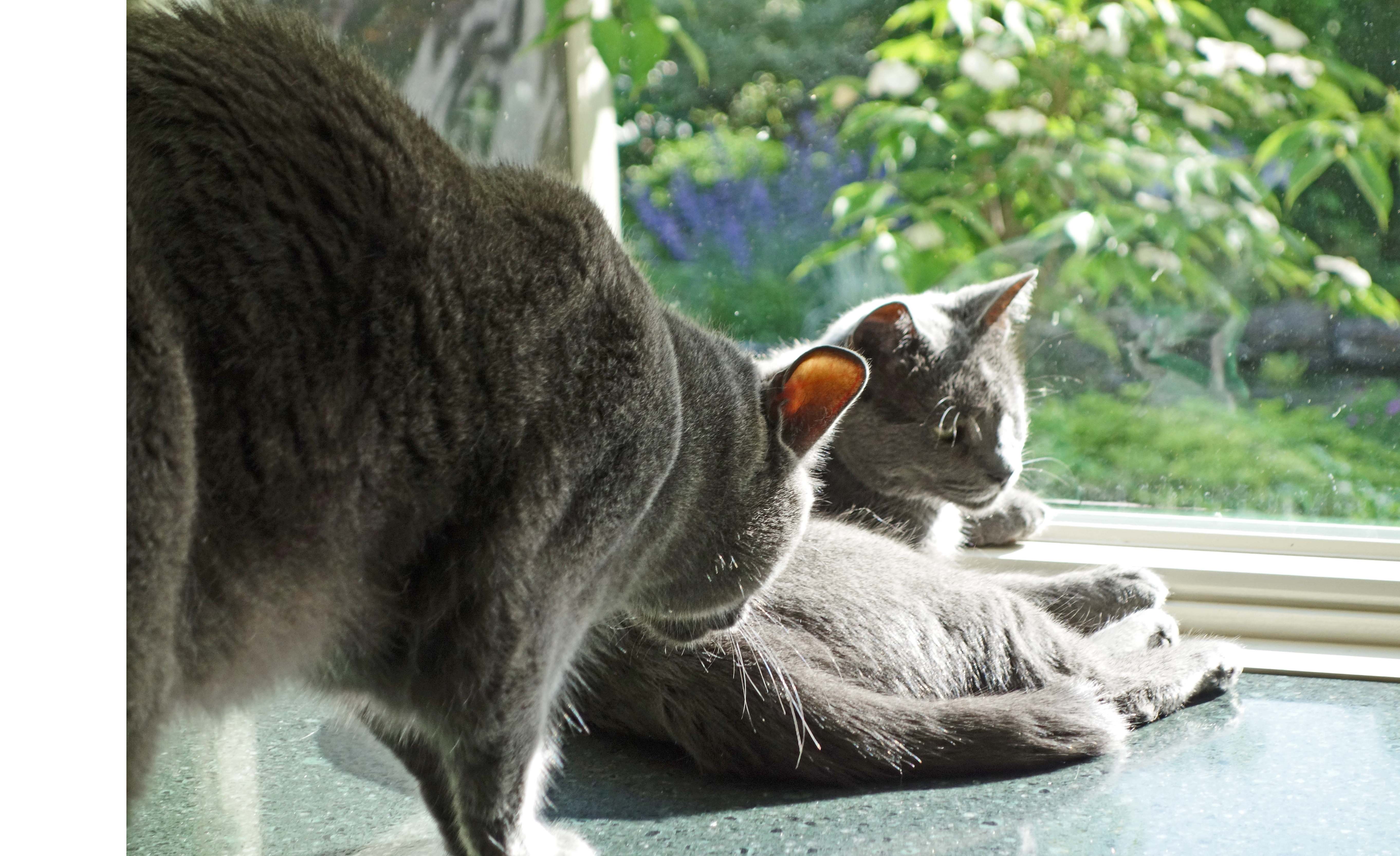 If you saw them in person they do not look like twins. Gracie is 7 lbs and Morgan is 12. Morgan looks like a Russian blue with a flatter face and Gracie looks more Burmese with a longer nose. Both are very outgoing cats. The older two don’t always let us pet them (and guests rarely see them) but the grays are always around and friendly to everyone.