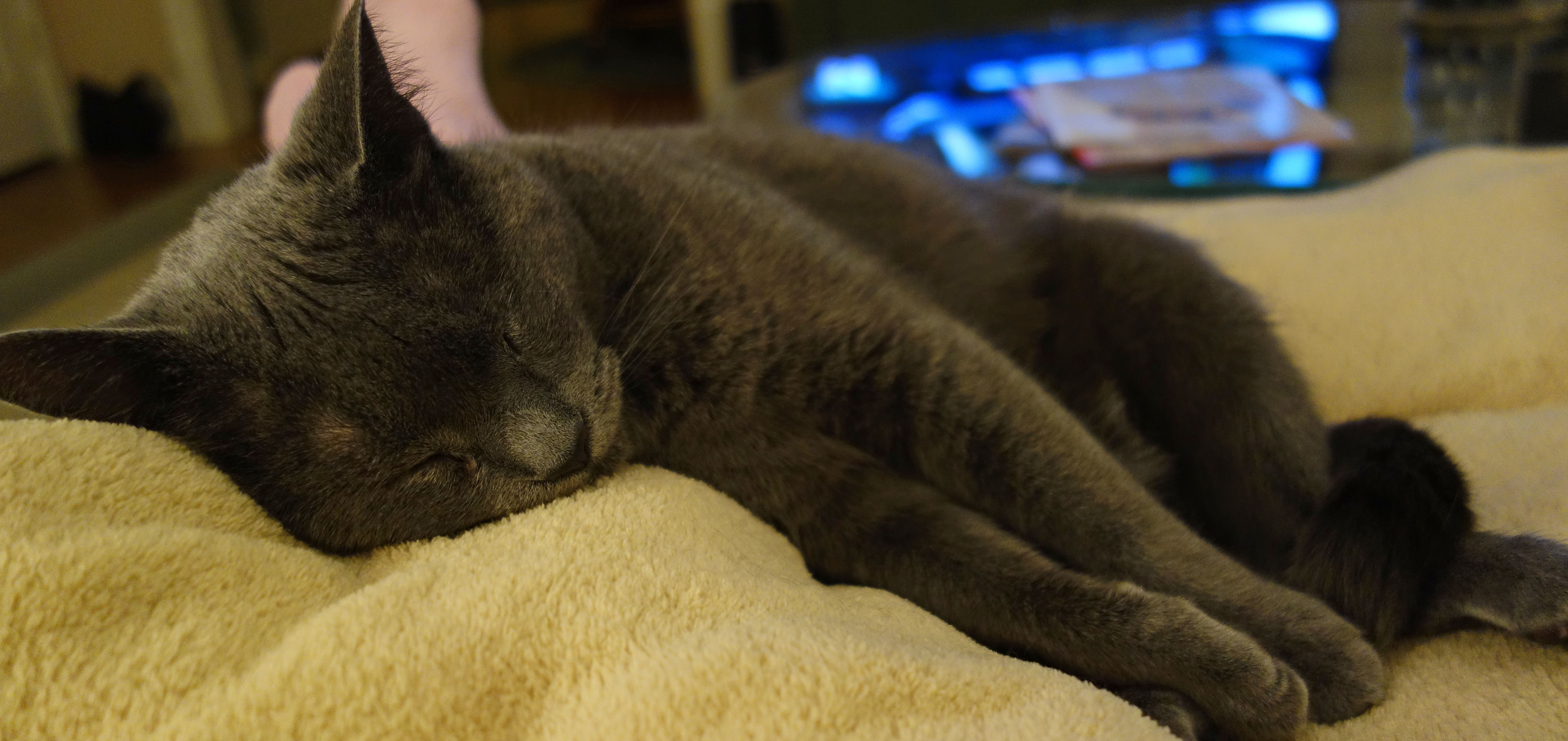 Under that fleecy throw are my legs. Gracie loves her fleece more than the other cats and it’s even better when there’s a human under it.