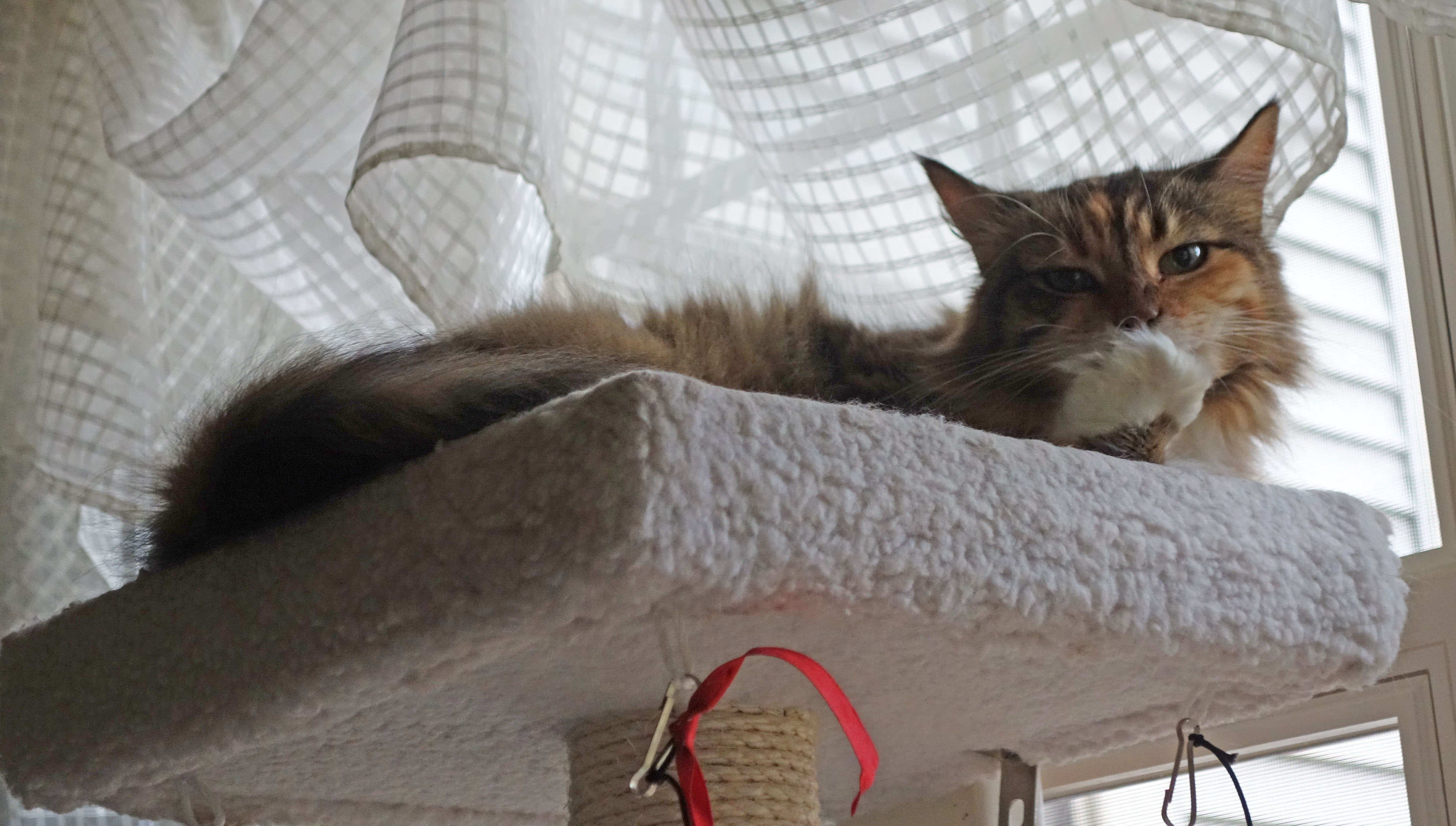 This is Mollie on the cat tree. She rarely goes there but with Morgan safely sleeping somewhere else she said “Why not?”