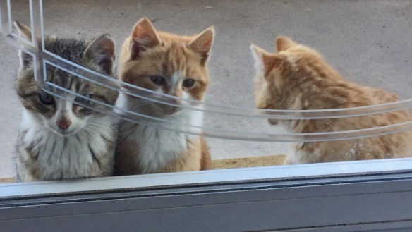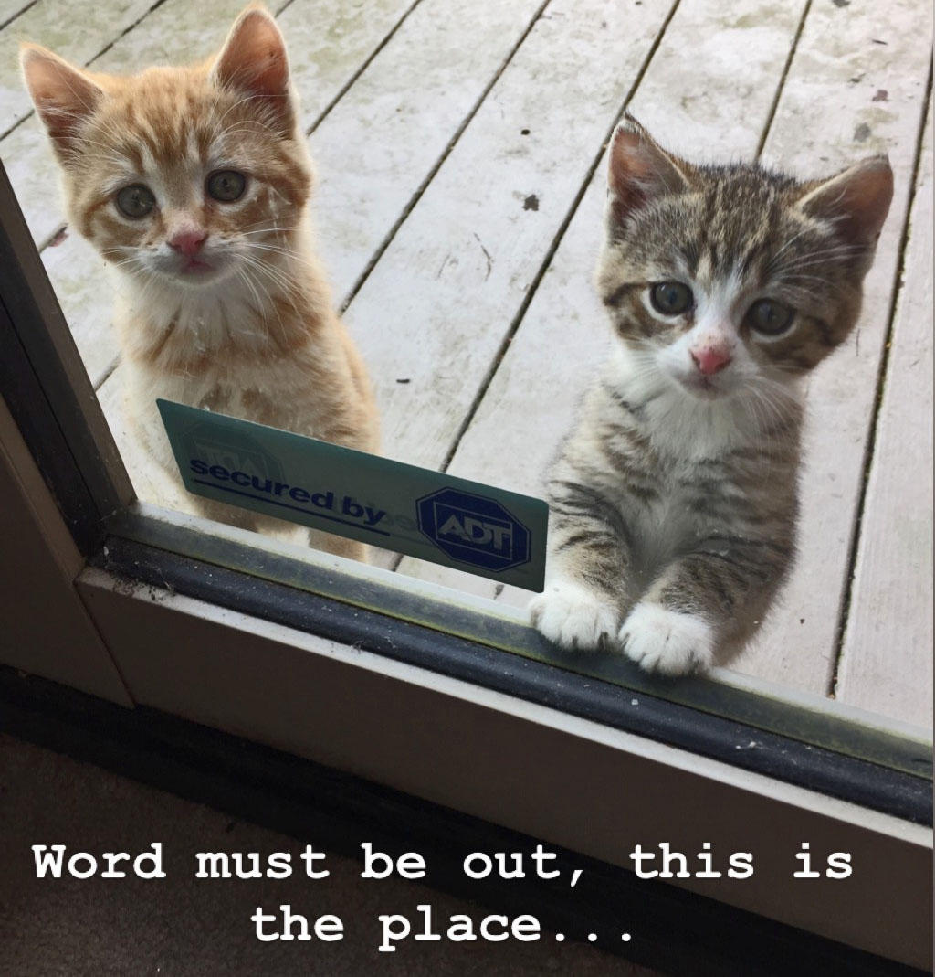My niece is a kind person. In her neighborhood there is a hussy female cat who has kittens regularly. She is not a dumb cat. She drops them off at my niece’s deck which opens into a full scale cat resort and goes back to the cantina to pick up a new boy friend. Last fall she saw this at her back door.