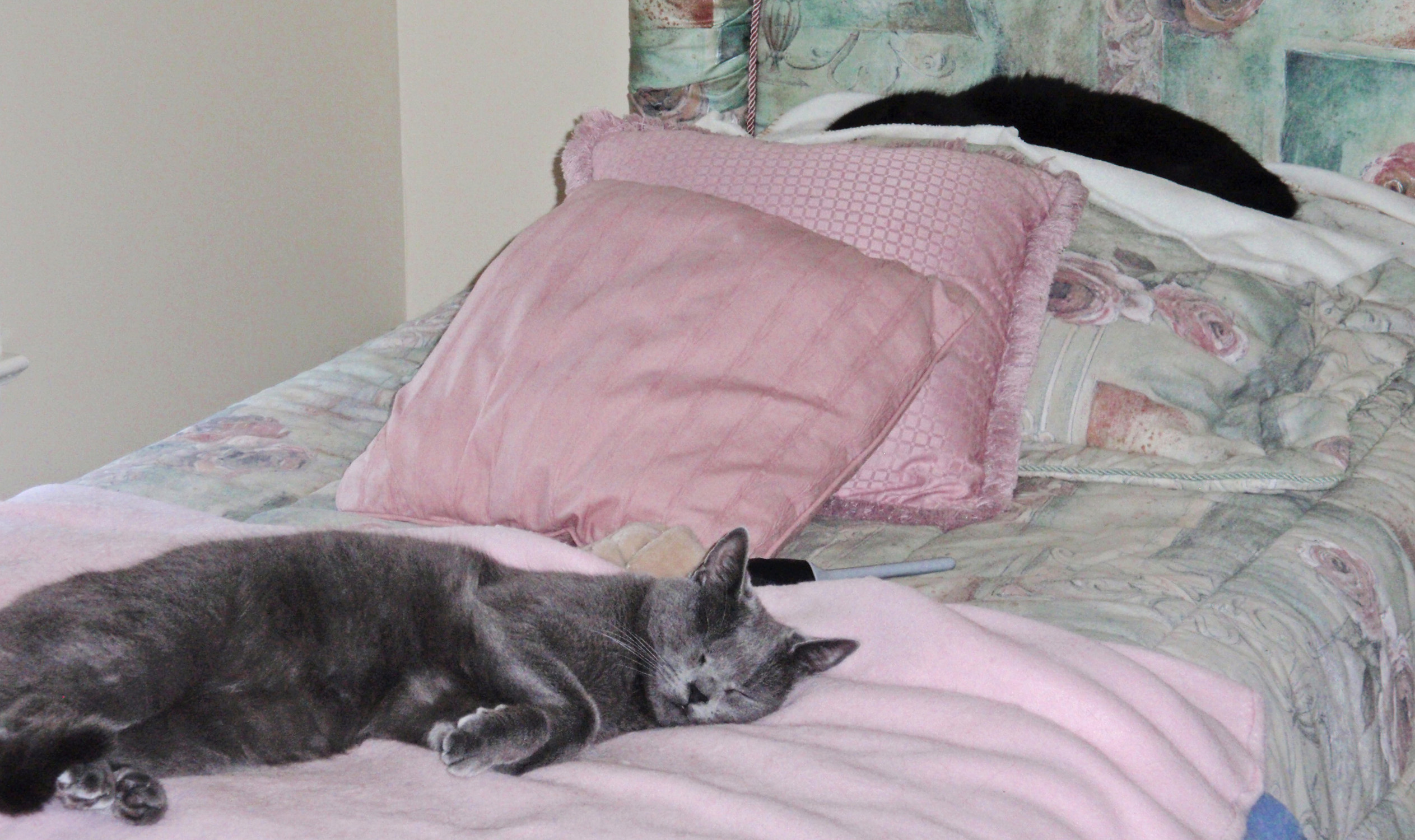 All the other cats loved boxes or paper bags, RC scorns both. Looks insulted if we offer one as amusement. The bed scene does look familiar!