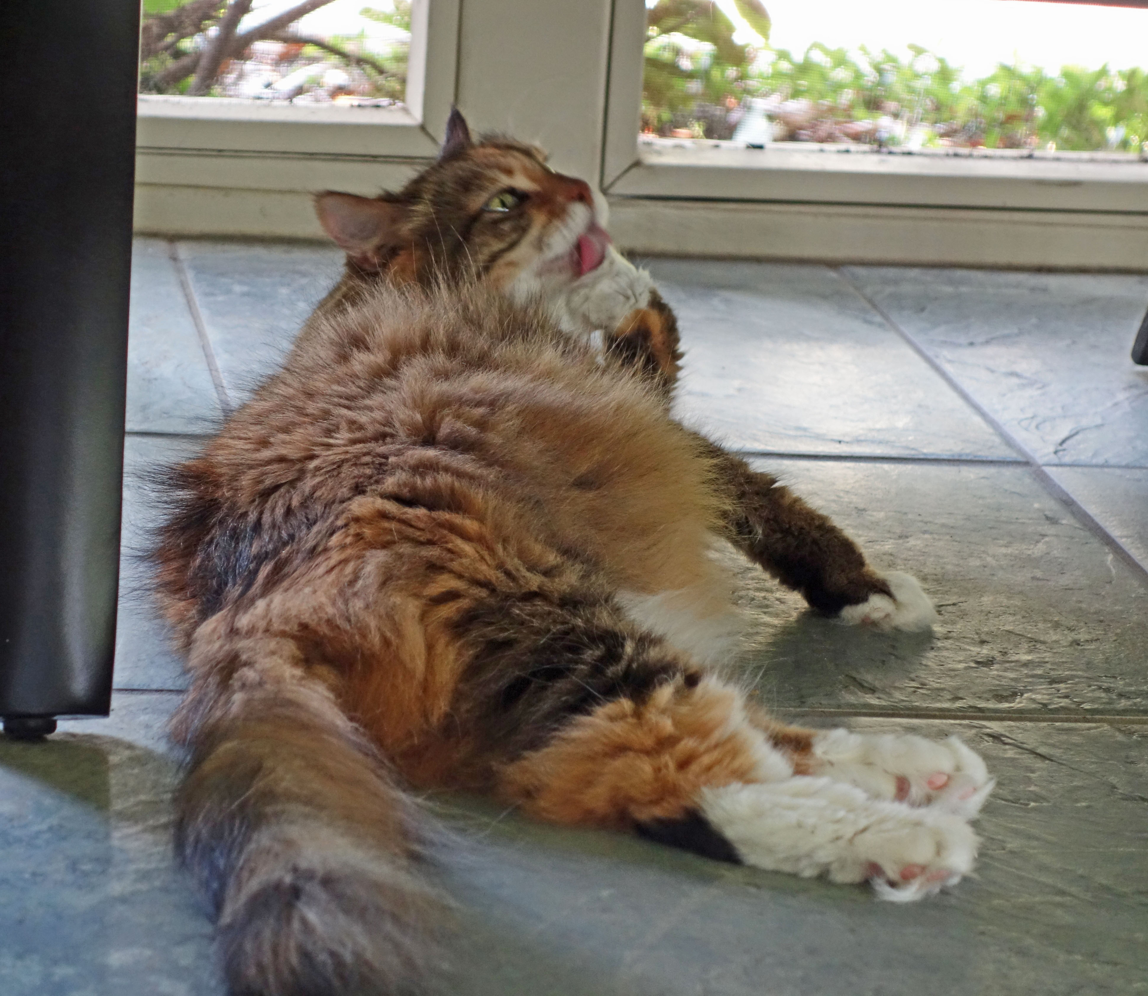 Graciel and Tim, of similar size, seem to have similar regard for their environment. Bijou at 12+ lbs never hangs off any surface. What is going on? Why don’t they curl when they reach an edge. I’ve seen Tim fall off because he refuses to acknowledge the limits of his space.