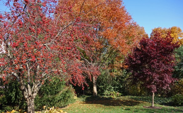 • It’s very unusual this year but we have a very large clump maple in the rear of the yard. It’s mostly green but has touches of red and yellow in it dispersed evenly around. It is the most beautiful it’s ever been. Most of our trees are pretty green yet except for our locust which has lost most of its leaves and the birch which is also an early dropping tree.
