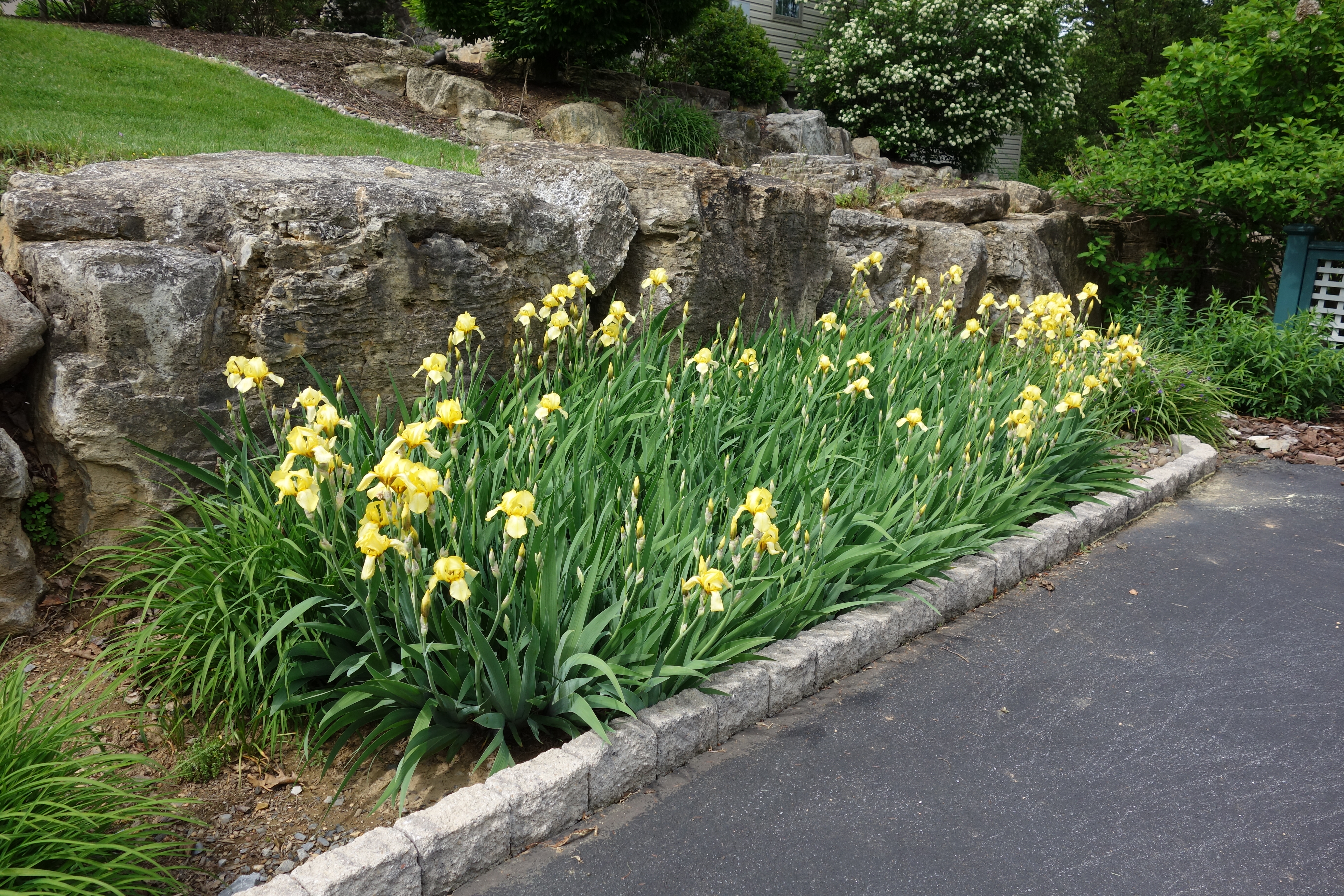 The wall it tall for sitting. It tapers to the front of the property but is 4′ at the back. I am a sucker for a beautiful flower.