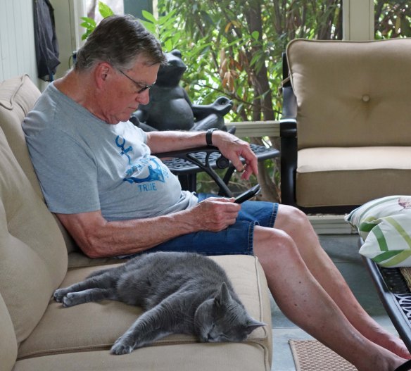 EveryBODY looks blissed out! The whiskers on that young’un! Wonderful pictures of the Sassy Cats and Morgan and Dan enjoying porch time.