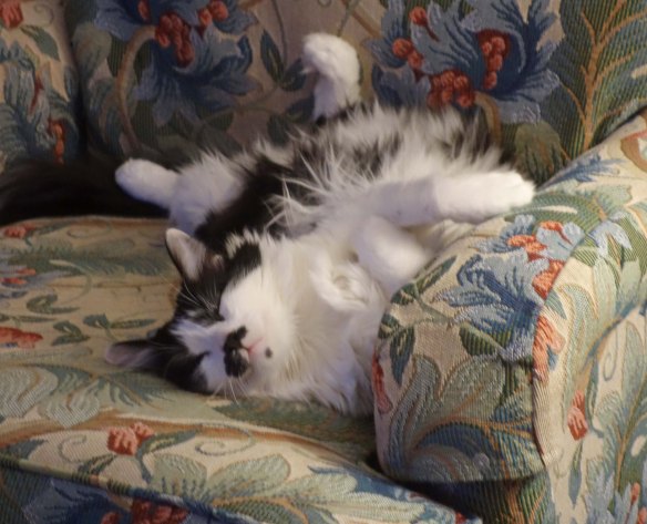 I love sleeping cats. Some sleep on the backs and curl up in a ball so you can’t find heads or tails! Morgan often sleeps with a beauty paw sticking out. I wasn’t expecting the change today but it happened. Have to figure out the pictures.