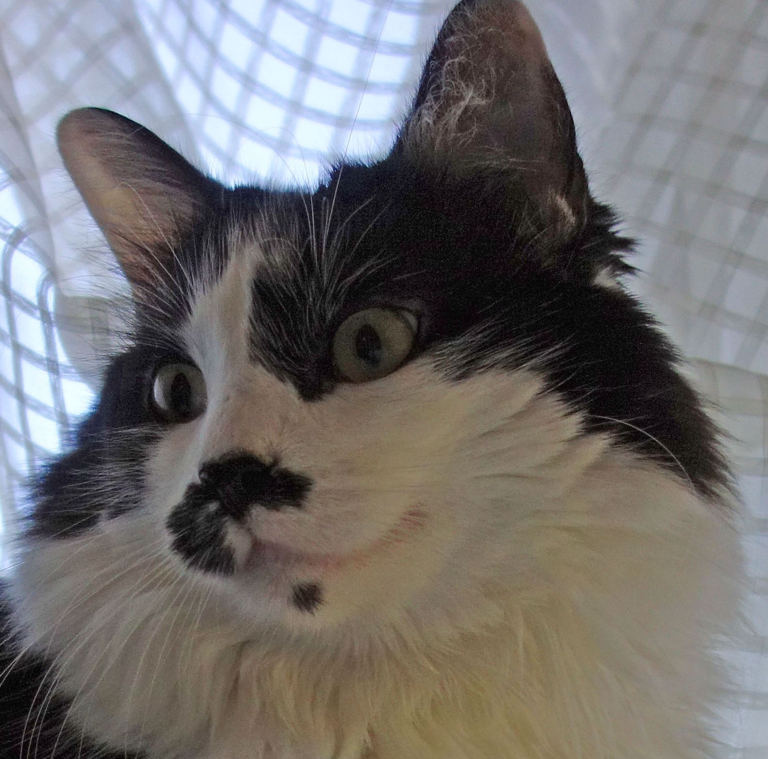 When I first came here she would give me growlies. I think she was playing hard to get. She got very flirty. She would swish that big fluffy tail in my face. Yeowza! She is so beautiful with a black freckle under her chin. Sometimes I lick it clean for her.