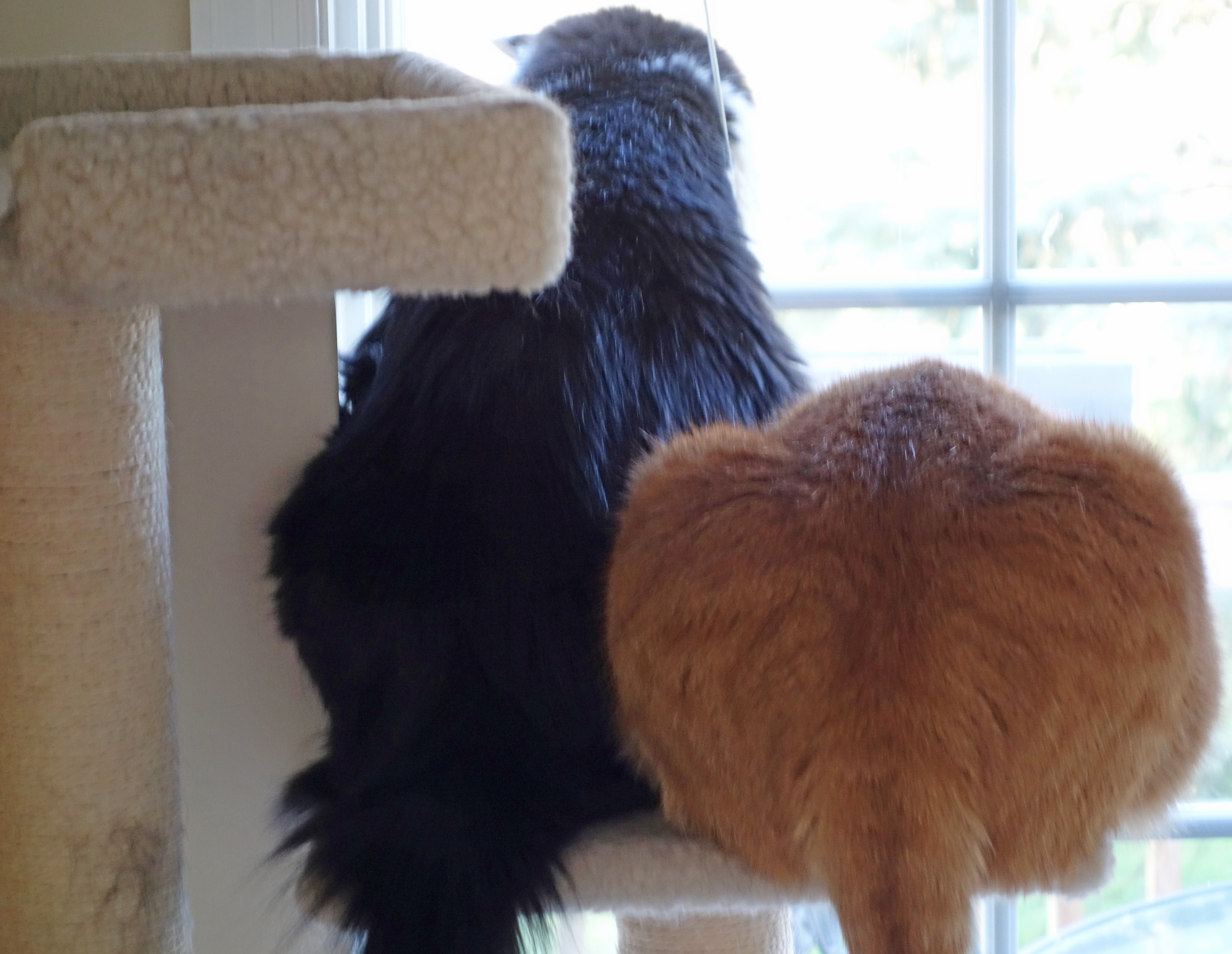 She always is with him. Sasha is not a solitary cat and the grays weren’t interested. I am happy that Gus was the right selection because it brought out a side of Sasha that makes her happy. His backside? Well, that’s another thing but her backside isn’t small either. They are the two chonkers in the family.