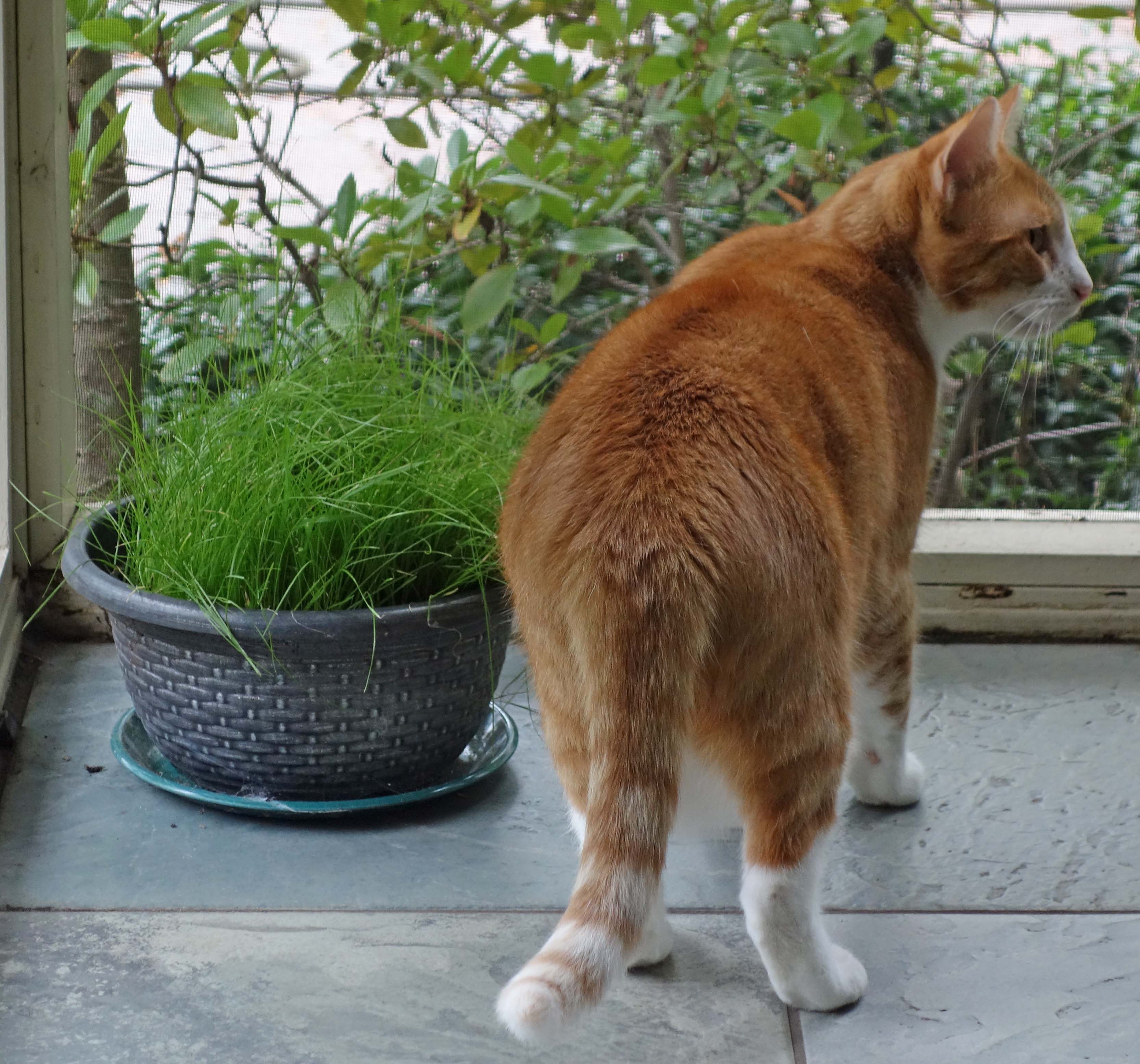 I would tell you my cats never go on my counters. They don’t. Honest. In the absence of absolute proof you make it up. My best guess is that either Morgan or Gus (Sasha is too chubby to jump that high and Gracie doesn’t like cat grass or counters ever) decided to investigate the green smell, triggered the water which terrified them and in their eagerness to escape knocked over everything.