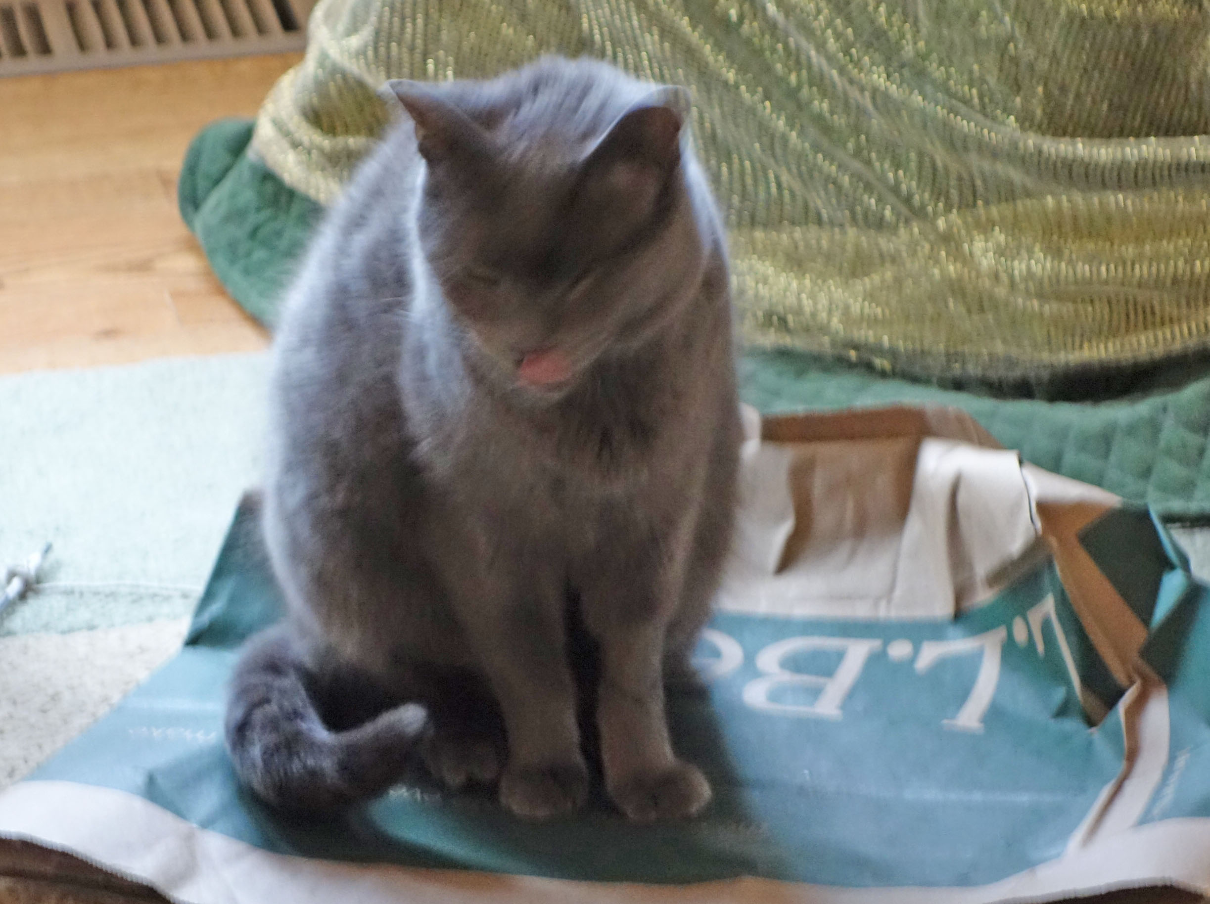 I did a shopping trip earlier this week and put the paper bag on the floor for Gracie. It’s where she always is. It’s a paper bag, not soft, no cushioning, but she likes it. Next to Bath and Body boxes, she likes L.L.Bean bags the best. Weird cat.