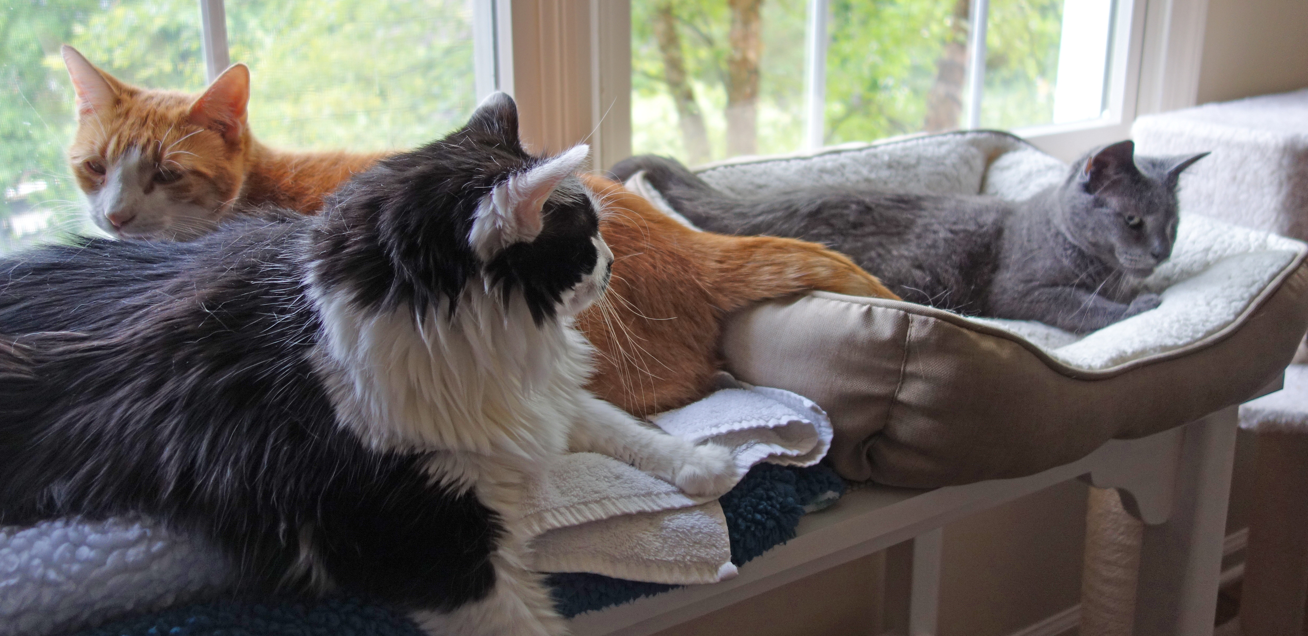 We need a bigger window! The peep said that although she took several pictures, not one has all of us looking toward the camera. We are cats after all!