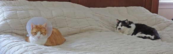 He doesn’t quite have the spatial adjustment down for the cone yet. Sasha came up to him and allowed him to groom her until he bonked her with the cone. She was out of there fast! His biggest disappointment (and mine) is that he can’t clean his booty. I’ve washed the fur back there but I can’t get the surgical area wet and that’s the stinky part. Vet appointment on Tuesday. I’m hoping they can spray it or do something to help him along.