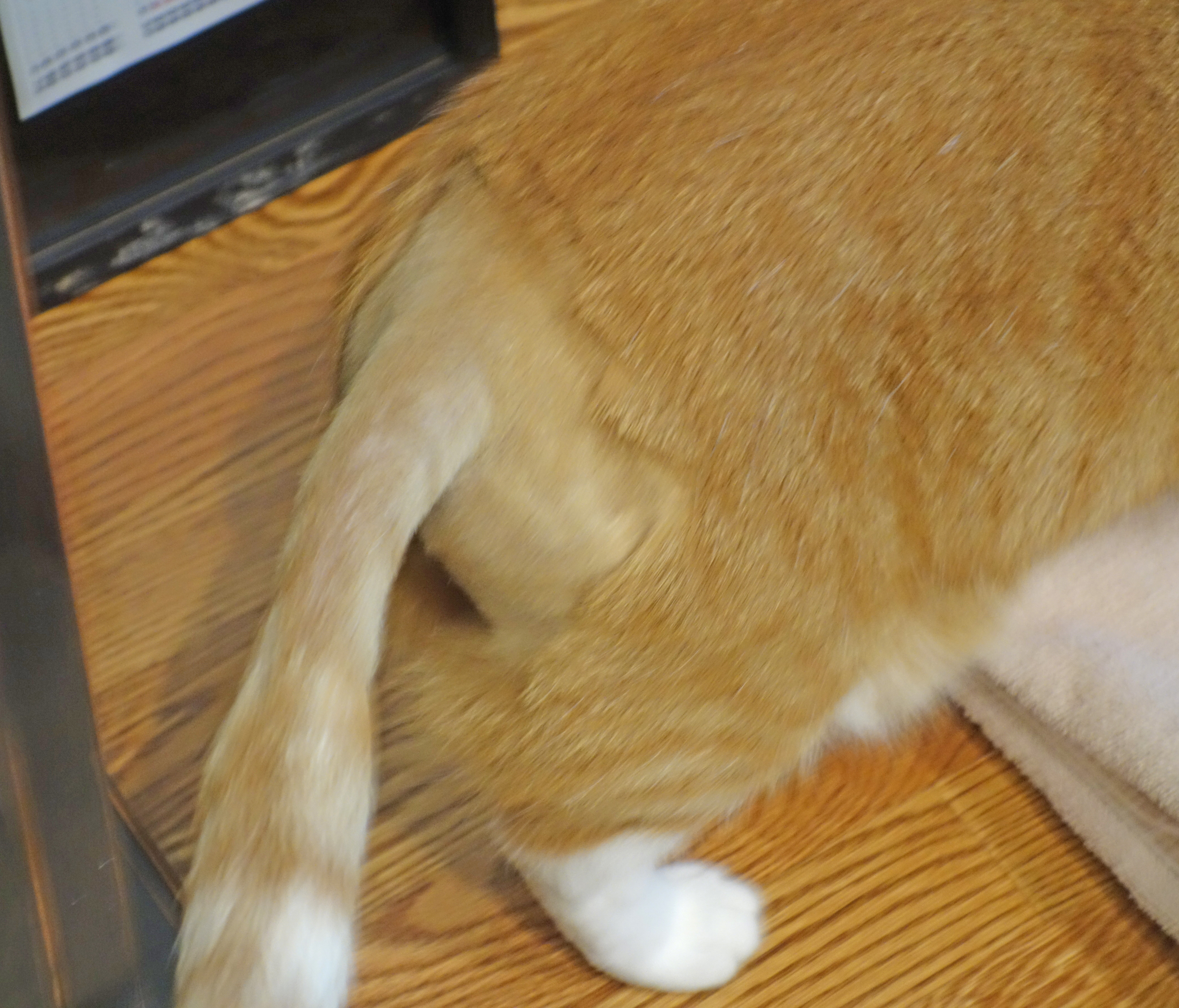 Gus is doing well after his surgery. His bum is still naked but there is peach fuzz growing. The male peep says he forgot to put his pants on, but the lady peep says he needs a toupee. There is a little scabbing, but the vet said that would take a few weeks so we’re not freaking out (yet). He smells normal, which is a relief. I don’t want people to think us cats aren’t clean.