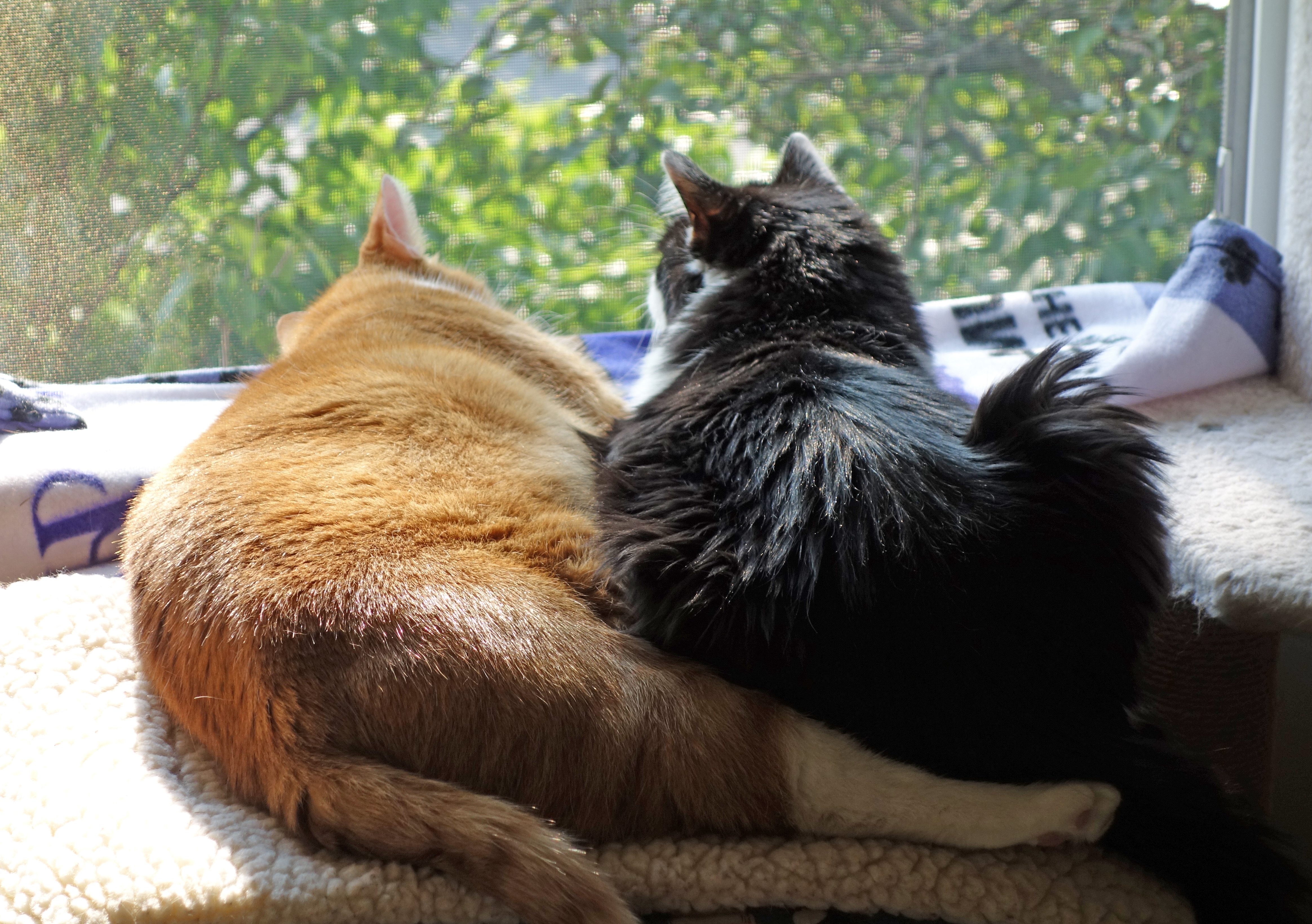 Gus and Sasha were doing their usual thing. The weather was wonderful so the cat room window was open every day. Everyone but me took turns on the sill watching the wildlife. I have the office window and I keep an eye on the neighbor’s cats. That’s a full time job.