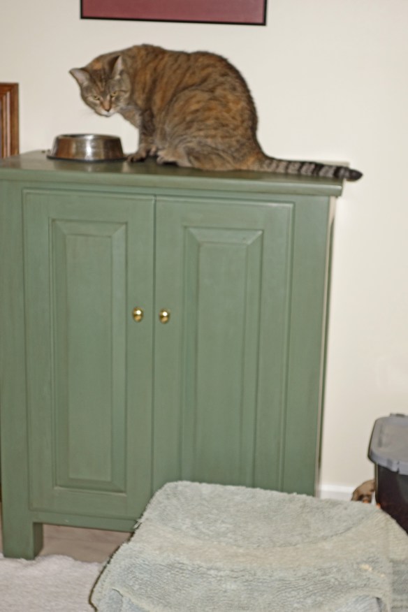 We have claw marks from Hazel (RIP) who wasn’t supposed to eat kibble. At the time we had other cats who did so we put the kibble on a tall cabinet that Hazel (who was a bit chubby) couldn’t jump up on. When she lost some weight, she managed to get up there leaving claw marks down the front of the cabinet. They are still there even though Hazel isn’t.