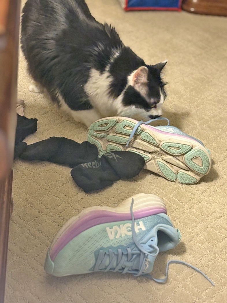 Author’s note: In a very surprising move, Sasha entered the room of the houseguest WHILE THE HOUSEGUEST WAS THERE, just to check out the sneakers. (Houseguest has several pets, many are cats so this may factor in.) This may be progress. Maybe. You are invited as long as your sneaks smell.