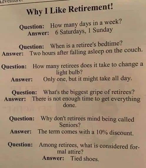 7. Love the riddles/giggles! As for standing on tall ladders, not a chance anymore. I just finished a 6 week class called A Matter of Balance that dealt with all the ways us older folks could fall, and why we don’t want to do that. I learned that my house is a death trap for falls in ever so many ways, all of that without getting on a tall ladder!