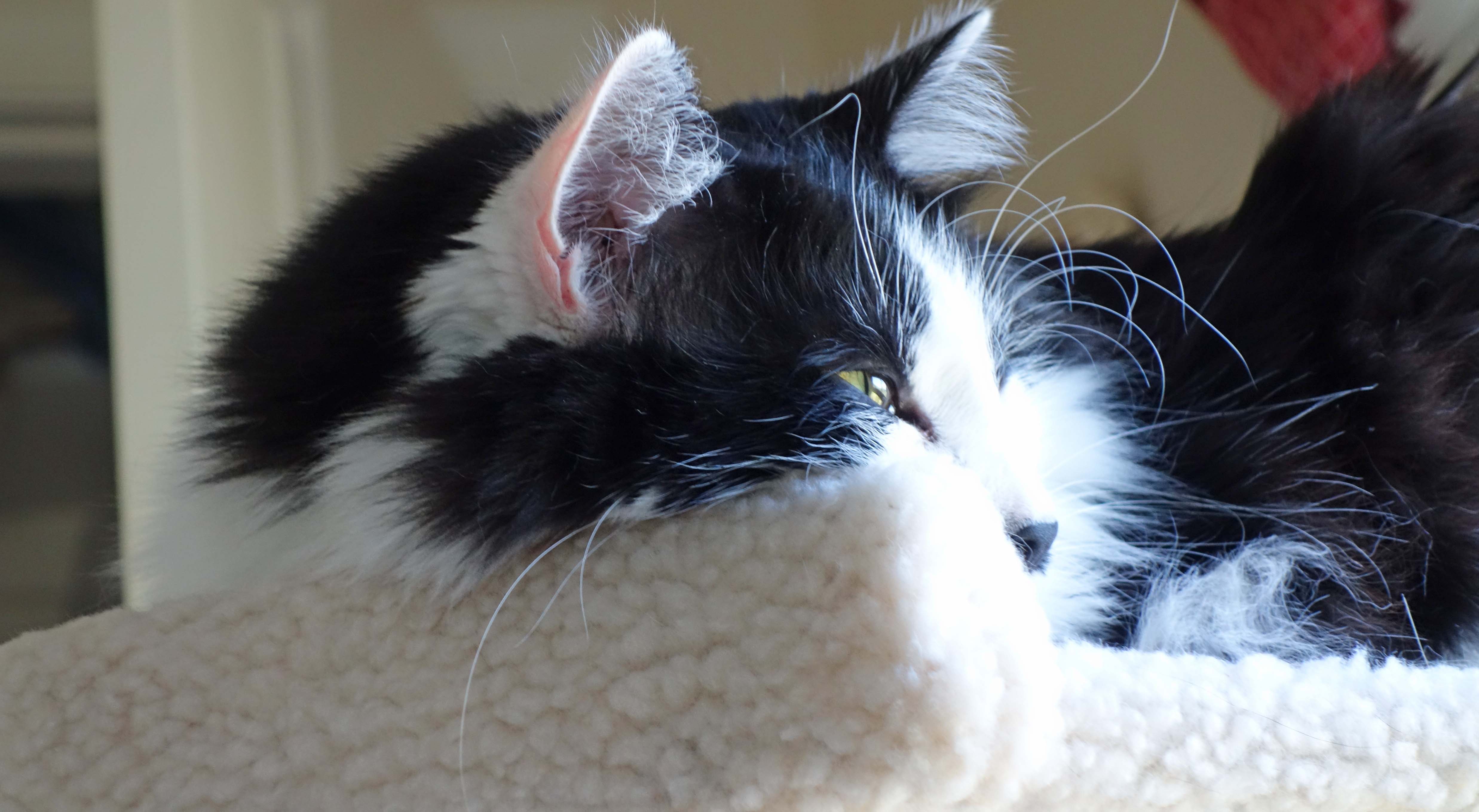Sasha: The bed is warm but I barfed on the cuddly cushion that was by the window so it’s in the laundry. We have to make do with a thin carpet you see. Boogers.