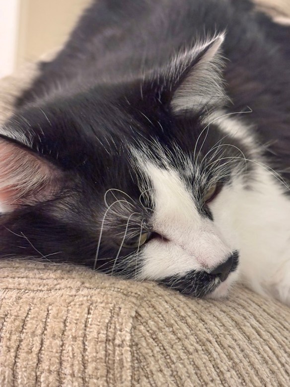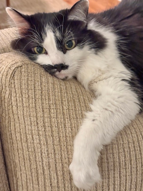 That second shot of Sasha is a real cheesecake photo, languishing on a couch, waiting for the Peep to bring her a tray of bonbons, or some nice kitty treats at least. Gus and Morgan are lookin’ good too, with considerably less maintenance to keep up appearances.
