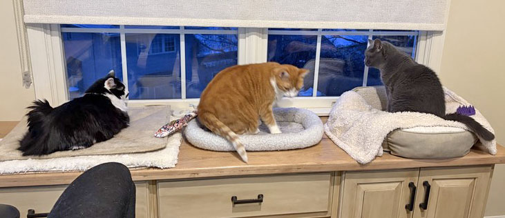 It’s the peep here. Sasha and Gus took off for the ski slopes so it’s just Morgan and us. Morgan had yet another vet visit this week and it looks like there will be another next week. She needs a scope, endoscopy or other type of test to determine her issue and the holidays are not a good time for staffing. We are hoping we can get this done next week. In the meantime we are keeping her as comfortable as possible and hoping for the best. Here is a picture of them taken this morning before Morgan (right) went to her favorite nap spot.