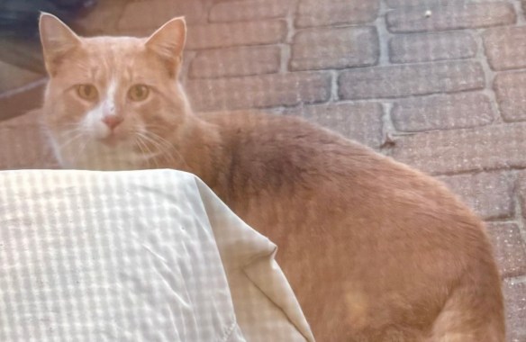 There is a new stray in the ‘hood. It’s a lovely ginger and frequents the next-door neighbor because she feeds two outdoor kitties. Our neighbor’s address is listed everywhere strays congregate! The peep is encouraging her to add him to her group. Her outdoor cats have a good gig. Two meals a day and a heated hut to sleep in. Personally I like my indoor gig better, but I can’t chase squirrels and stuff.