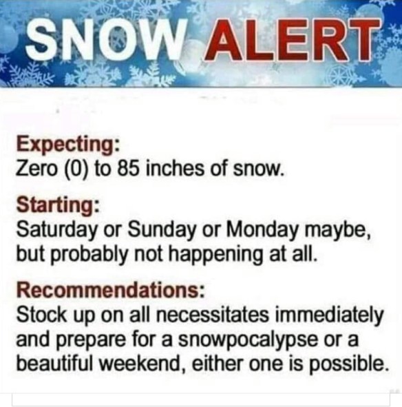 I love that forecast of zero to 85 inches of snow. All I want is a blanket of snow that will last at least five hours.