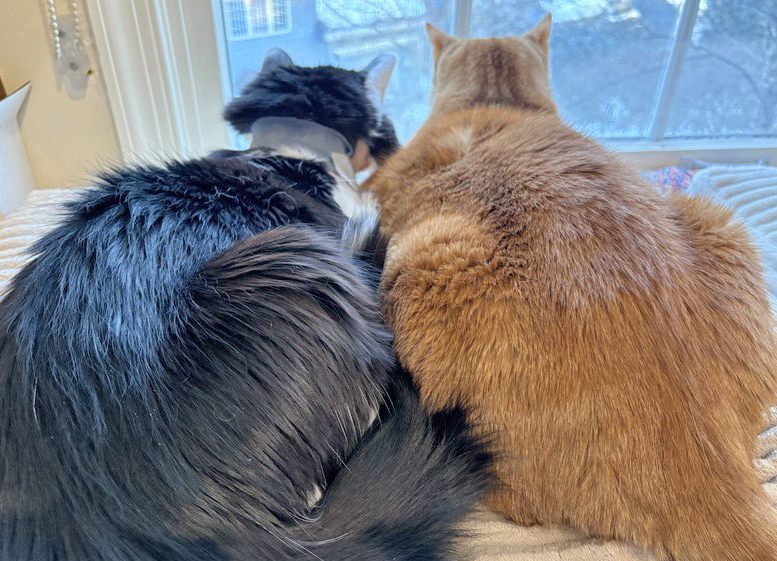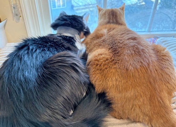 That is their after breakfast neighborhood watch. Eventually Gus goes to the heated bed (which Sasha doesn’t like) and Sasha stays on the window bed for a nap. I bought new cushions last week and they are loving them.
