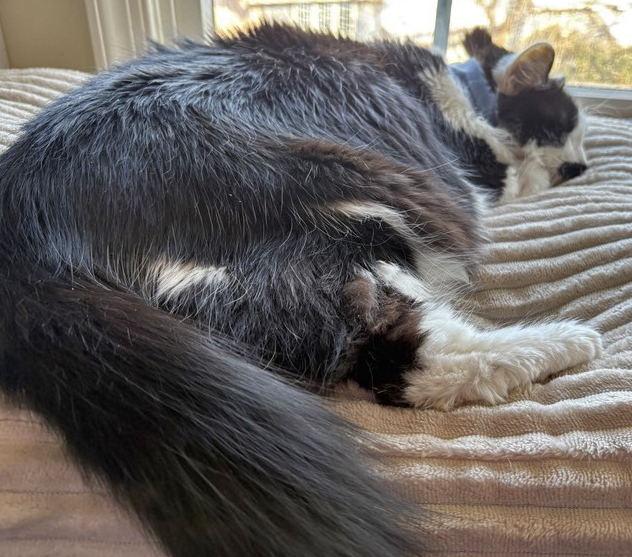 Sasha in one of her favorite spots. If you look closely you can see part of the shaved area under her right cheek.